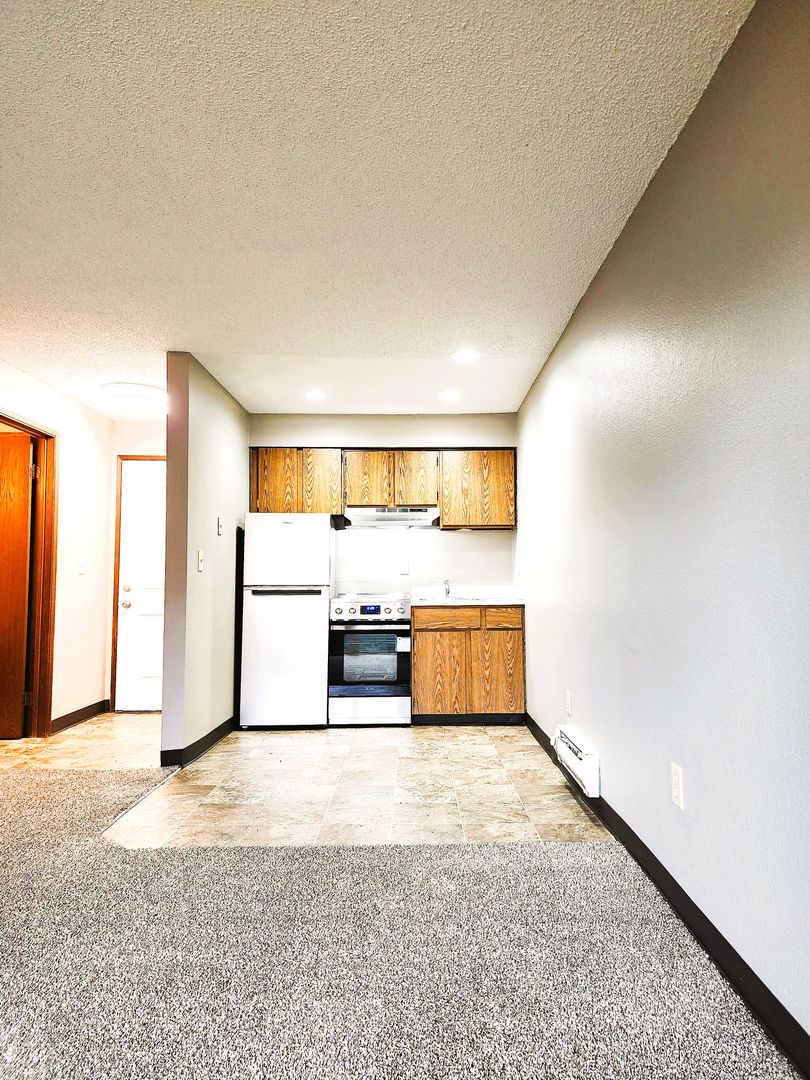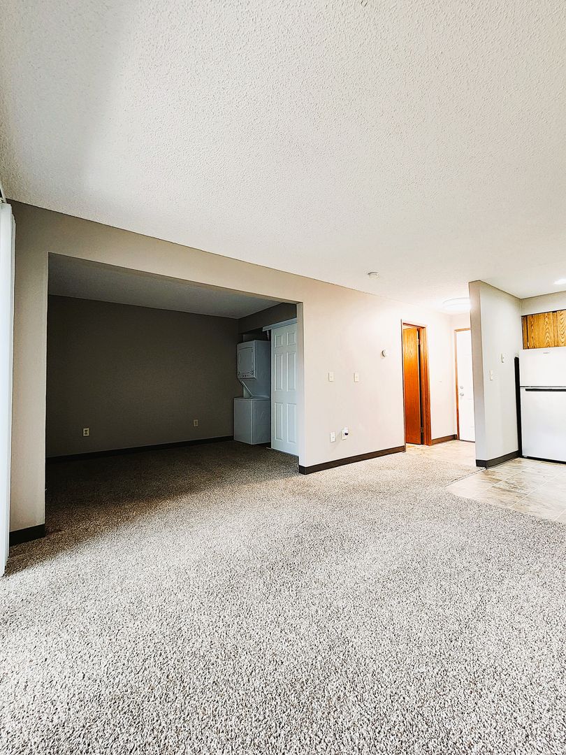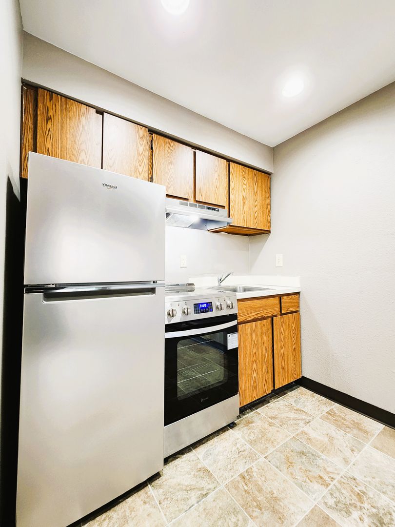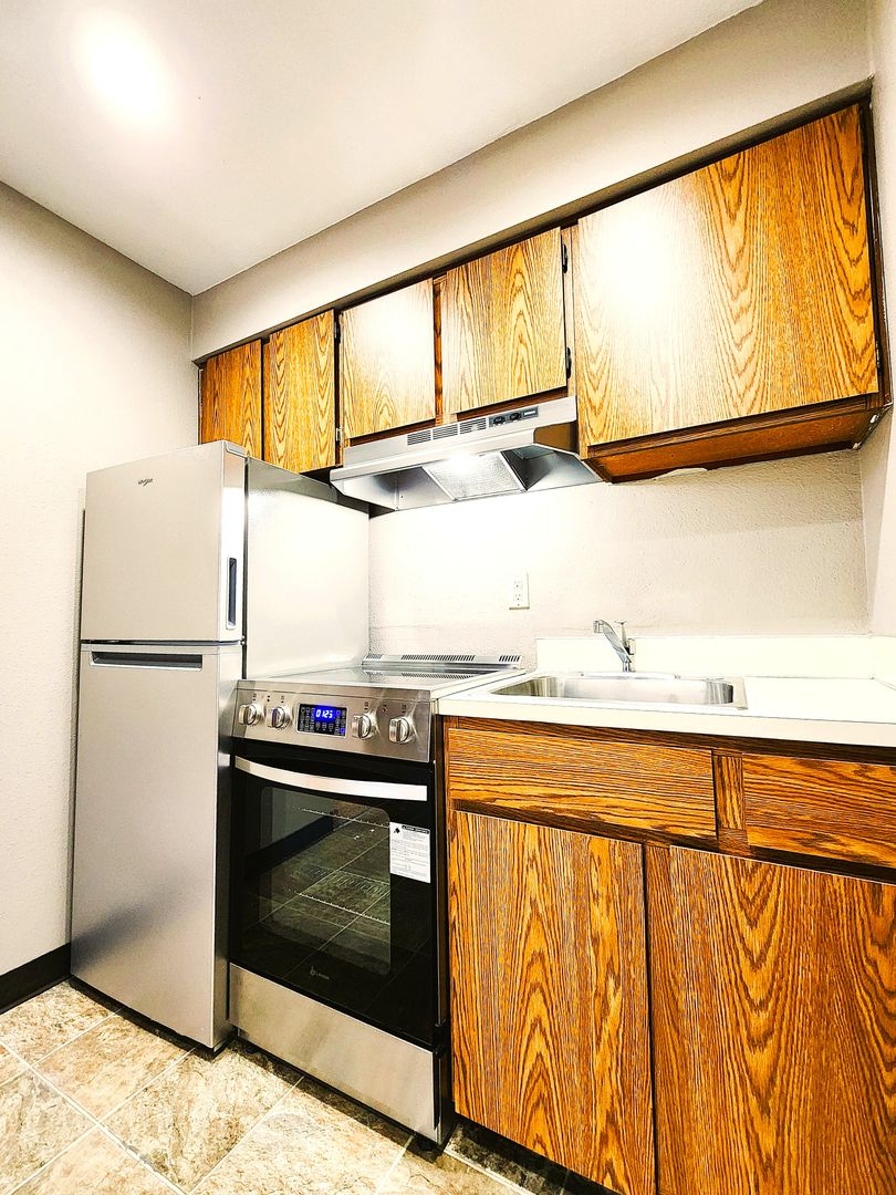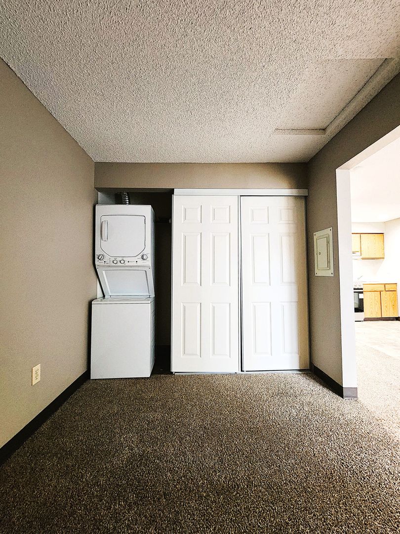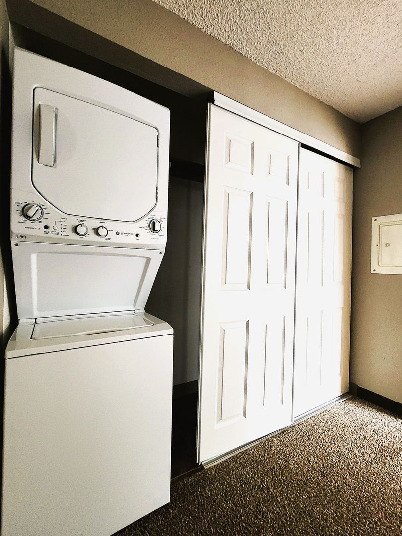 Studio apartment with stainless steel appliances plus stacked washer & dryer